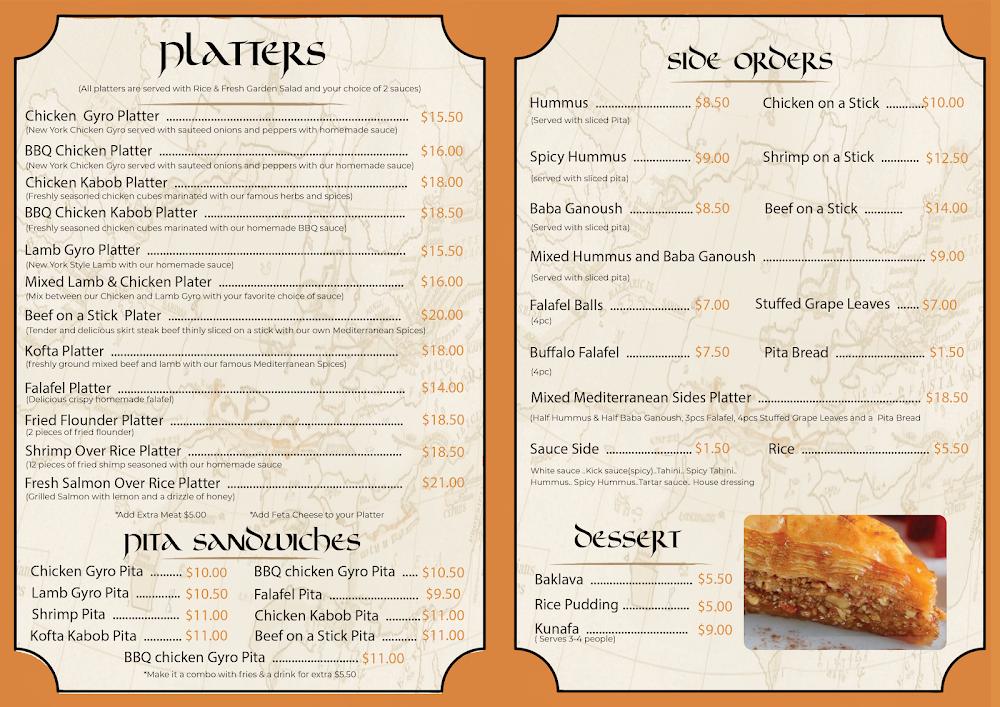 Standout platters include BBQ Chicken and Lamb Over Rice, both served with rich sides. The pita sandwiches are also crowd-pleasers, with options like Kofta and Chicken Gyro.